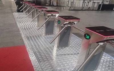- Catracas em aço inox com sistema de baixa automática de braço para evacuação rápida de multidões.